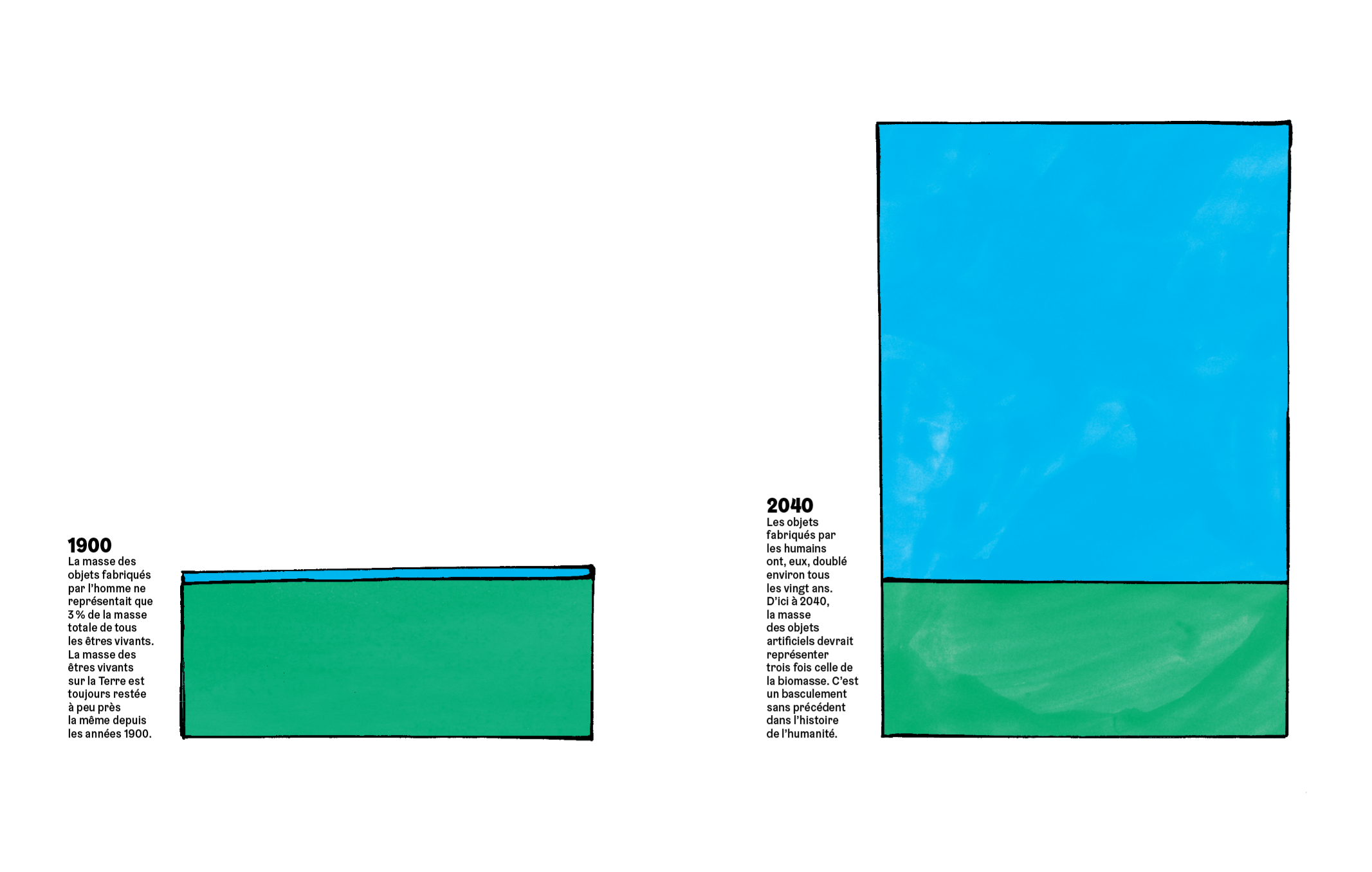 La civilisation du déchet réunit les déchets solides à travers tous nos milieux : terre, mer, air et espace. L’urbaniste Jérémie Cavé et l’anthropologue Yann Philippe Tastevin transfigurent le statut de nos ordures pour en faire un objet de réflexion philosophique et métabollique de notre relation à l’environnement. À travers le cycle de vie de six objets du quotidien, représentant six fillières industrielles différentes, nous explorons notre rapport humain aux ressources et au temps de notre planète. Le déchet devient une échelle de mesure pour nos pespectives anthropiques. La démonstration repose sur une co-enquête fouillée et documentée, ainsi que sur les travaux de terrain d’autres scientifiques sur tous les continents. Mon travail d’autrice-illustratrice visait à retranscrire les outils d’enquête et de terrain en image, ainsi qu’à représenter visuellement des informations quantitatives et qualitatives.